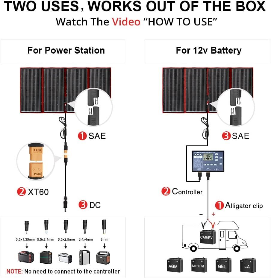 - 【COMPLETE BUNDLE READY TO GO】 Includes the 300W foldable panel, separate controller, SAE/XT60/Alligator clips, DC5521/5525/35135/6440 adapters, 9.85ft cable, storage bag, and manual—a one-stop kit for camping, RVing, or emergency backup.