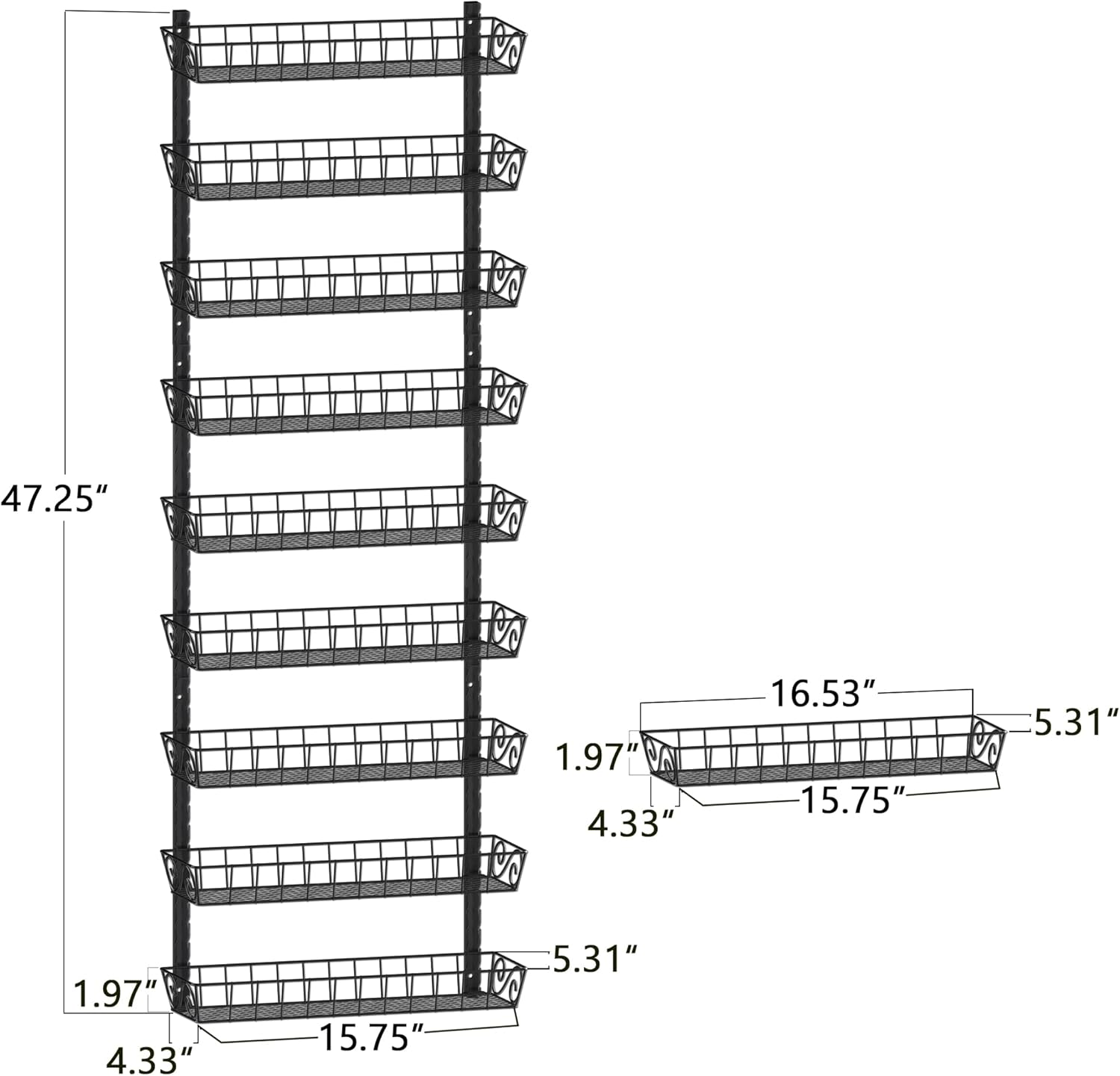 - Spice Rack Size, entire large rack organizer: 15.75"L x 4.33"W x 47.25"H, single spice rack: 15.75"L x 4.33"W x 15.75"H