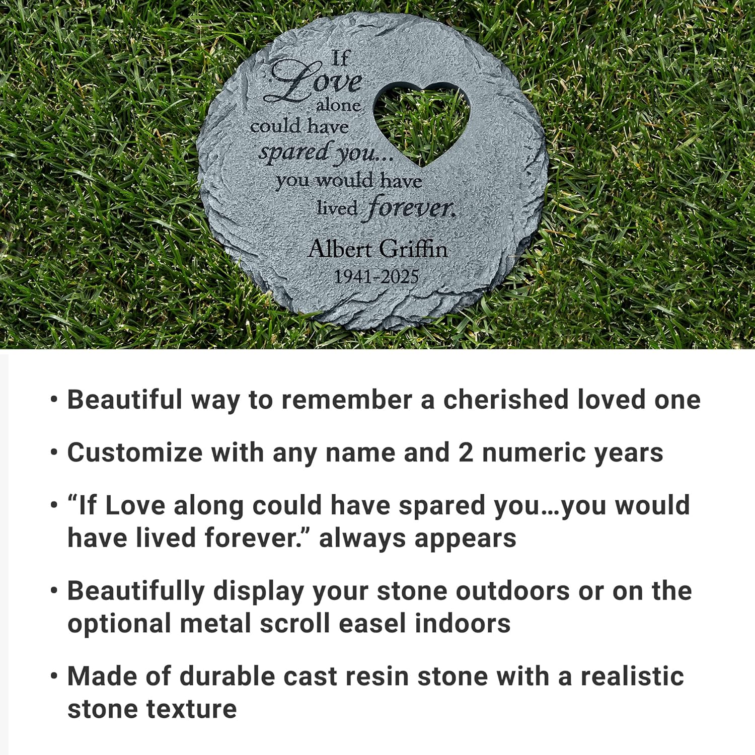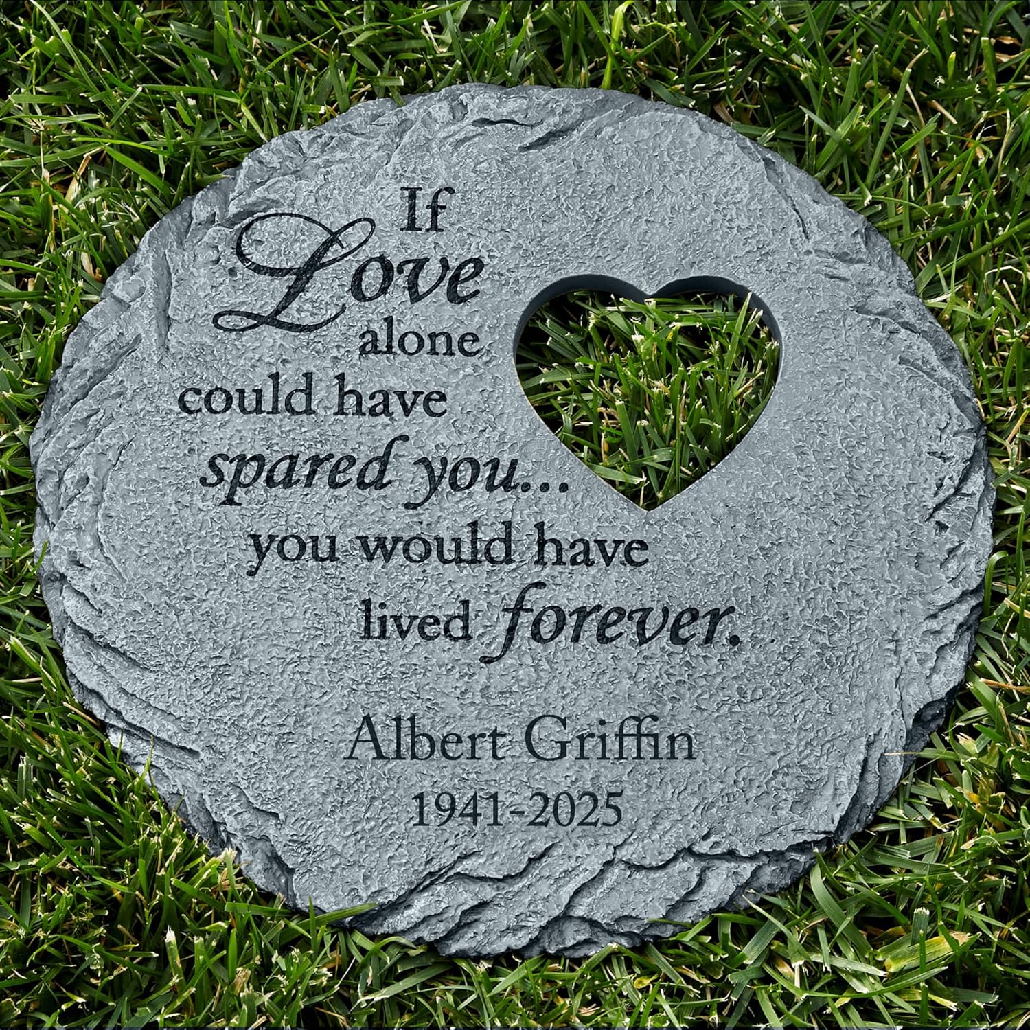 - UNIQUELY PERSONALIZED: Make their memory live forever. Customize your elegant and timeless garden stone with their name up to 22 characters and 2 numeric years. “If Love alone could have spared you…you would have lived forever." always appears.