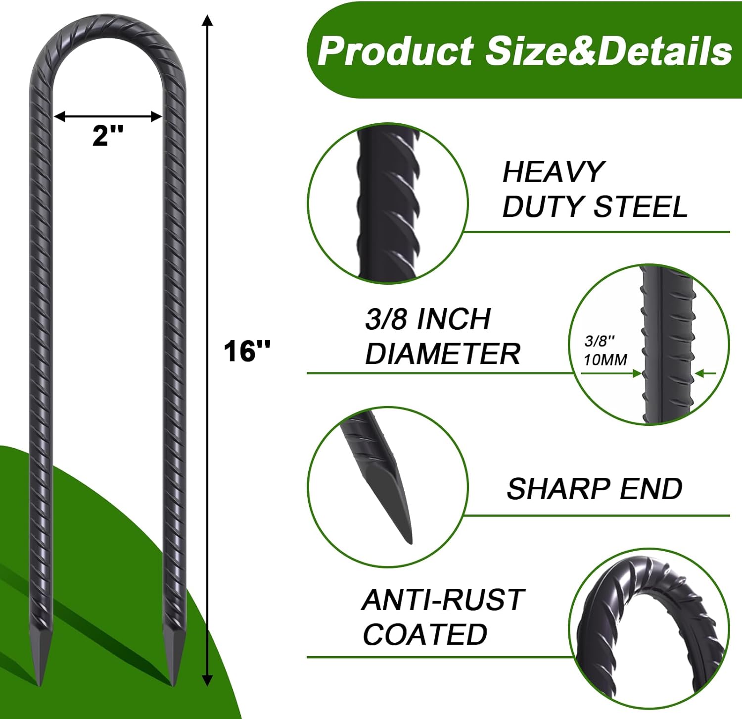 - SHARP END - Chisel pointed ends help u shaped stakes can sink deep into the dirt, grass, sand, hard clay and rocky soils by using a hammer. These 16 inch extra long trampoline stakes with ridges help prevent the stakes from pulling out during high winds or hurricane.