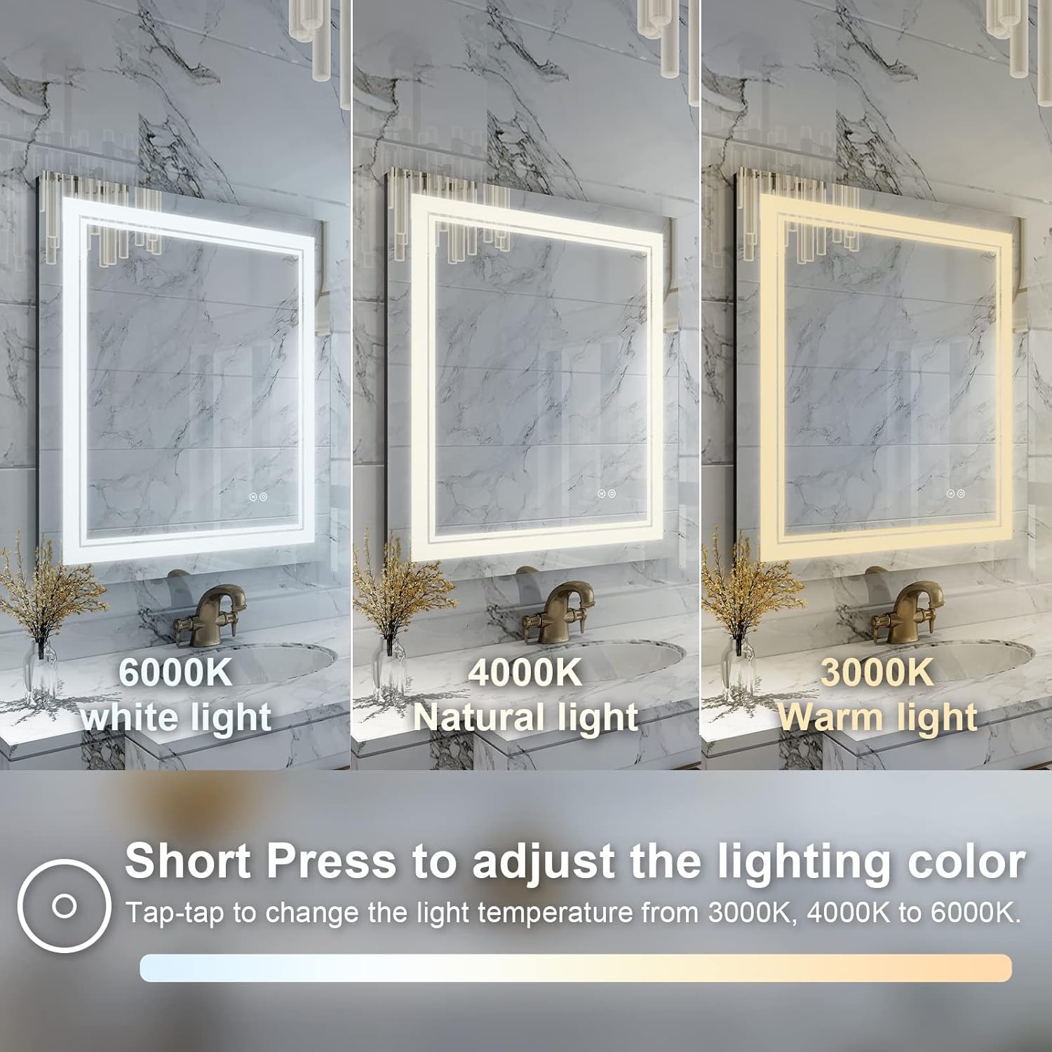 - Dimmable: Our smart vanity mirrors can adjust the color (warm, natural and white) and brightness (100%-10%) of the lights. Not only that, the lighted bathroom mirror also has a memory function. The next time you turn it on, it will keep the light color and brightness that suits you best. Perfect for hotels, high-end salons or bedrooms and bathrooms at home.