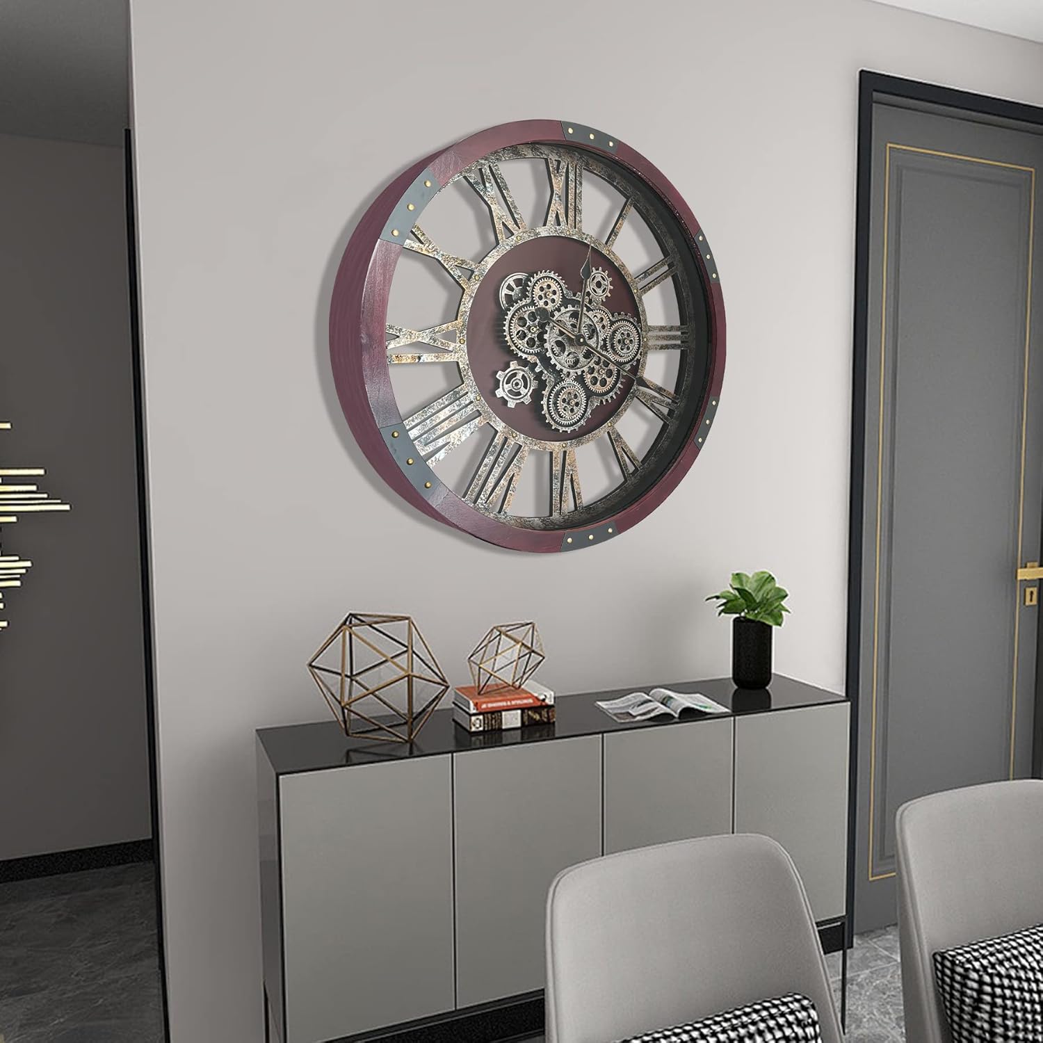 - Real Moving Gears Wall Clock: The rustic wall clock is design with multi-real moving gears, put battery in, various gears start working, makes a subtle relaxing sound and makes a living element in the environment in where it is placed, vintage and magical, catch all eyes of visits