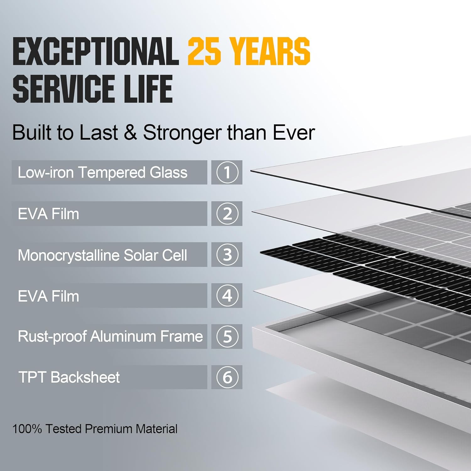 - 【High-Efficiency Solar Panel】- This 200W solar panels, made of premium Grade A+ monocrystalline solar cells, has an excellent conversion efficiency of 23%-30%.