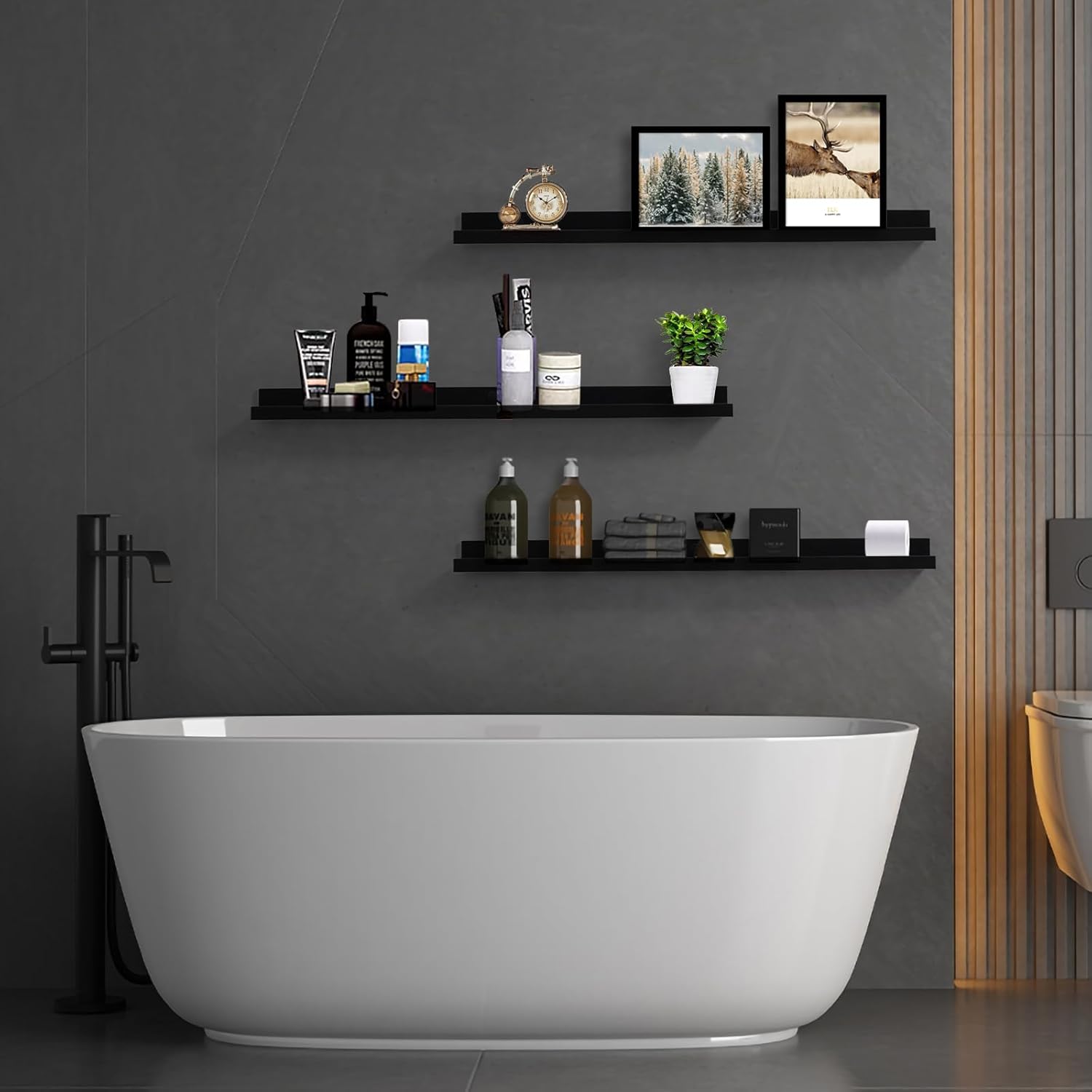 - [Safe Design, Adds Style to Home Decor]: The combination of pine wood and black finish gives this bathroom wall shelves a modern minimalist style aesthetic that perfectly matches any style of furniture and decor.Designed with a front ledge, each shelf effectively protect items from falling off.