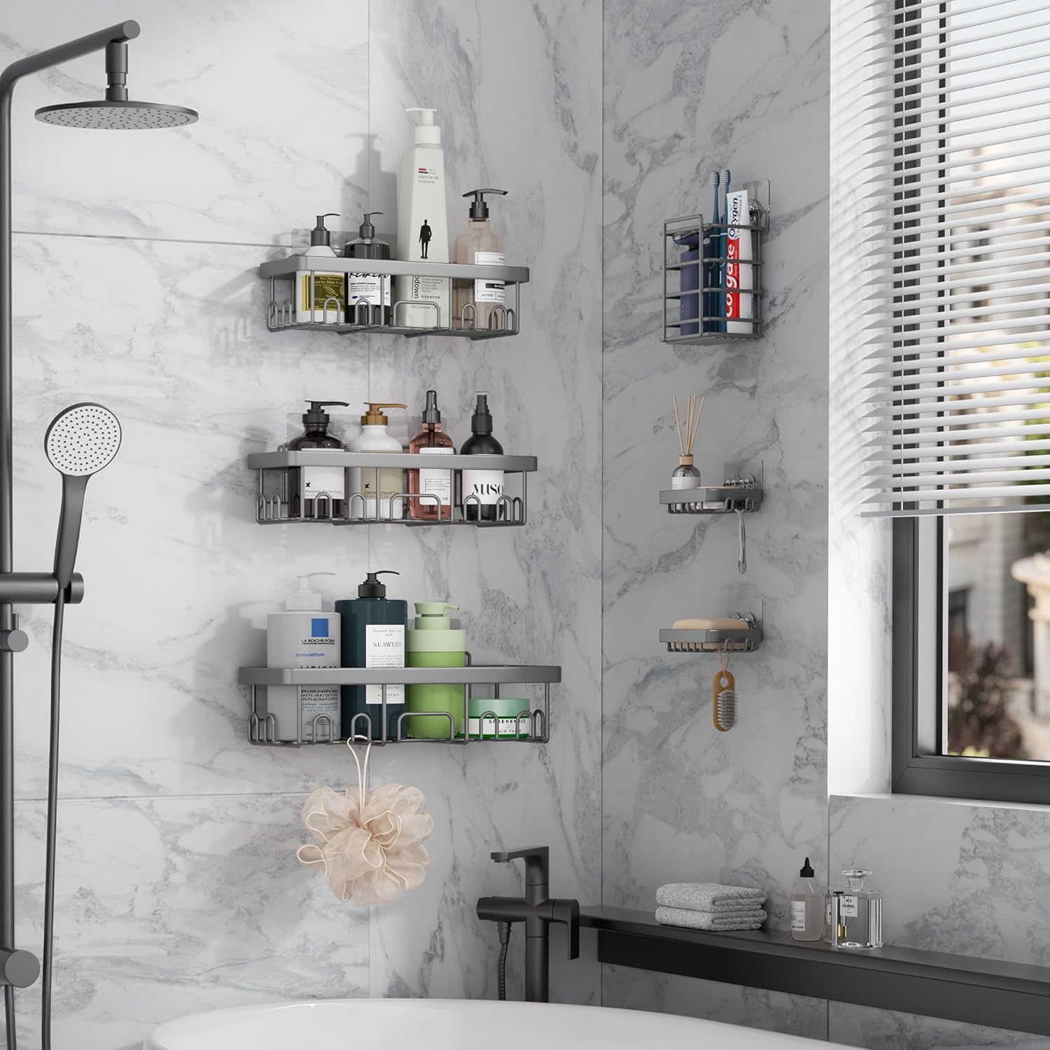 - Comprehensive Organization: This 6-piece set includes large, medium, and small caddies, along with soap and toothbrush holders, providing versatile storage for all your shower essentials