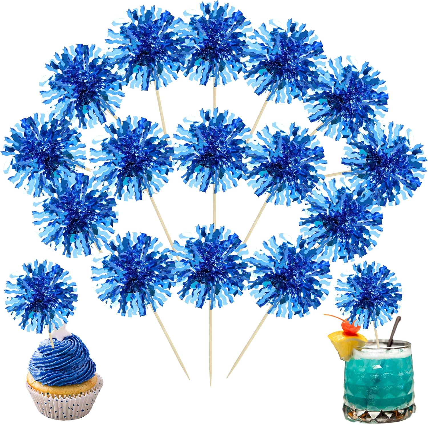 Ephlyn 30Pcs Foil Firework Cupcake Toppers Blue Tinsel Flower Drink Stirrers Cocktail Food Fruit Cake Toppers for Valentine's Day Party Decorations Blue