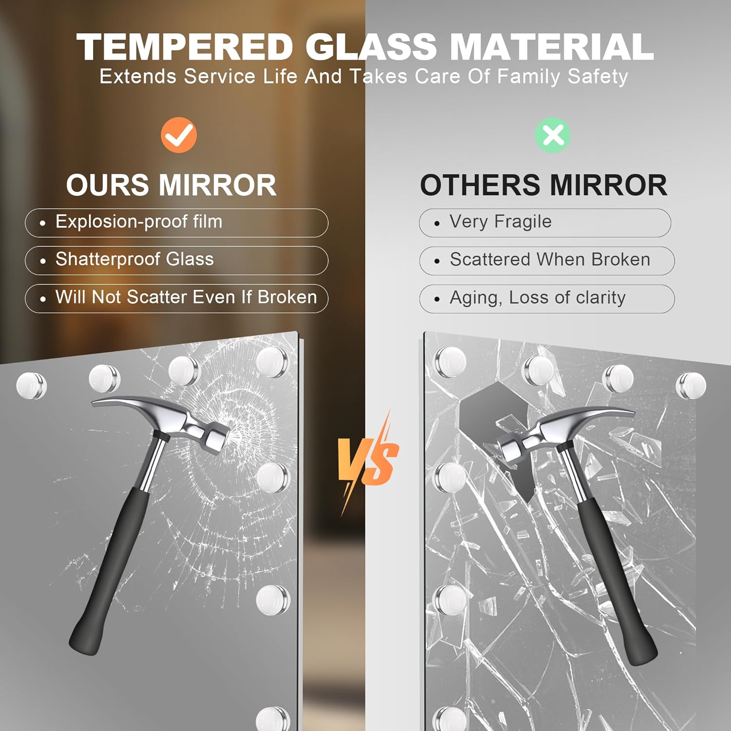 - 【Shatterproof, Safe and Durable】 Made from 4mm aluminum tempered explosion-proof glass, the mirror ensures safety and durability. It has passed drop, impact, and pressure tests. The reflection is clear and distortion-free. Remember to remove the anti-scratch film before use.