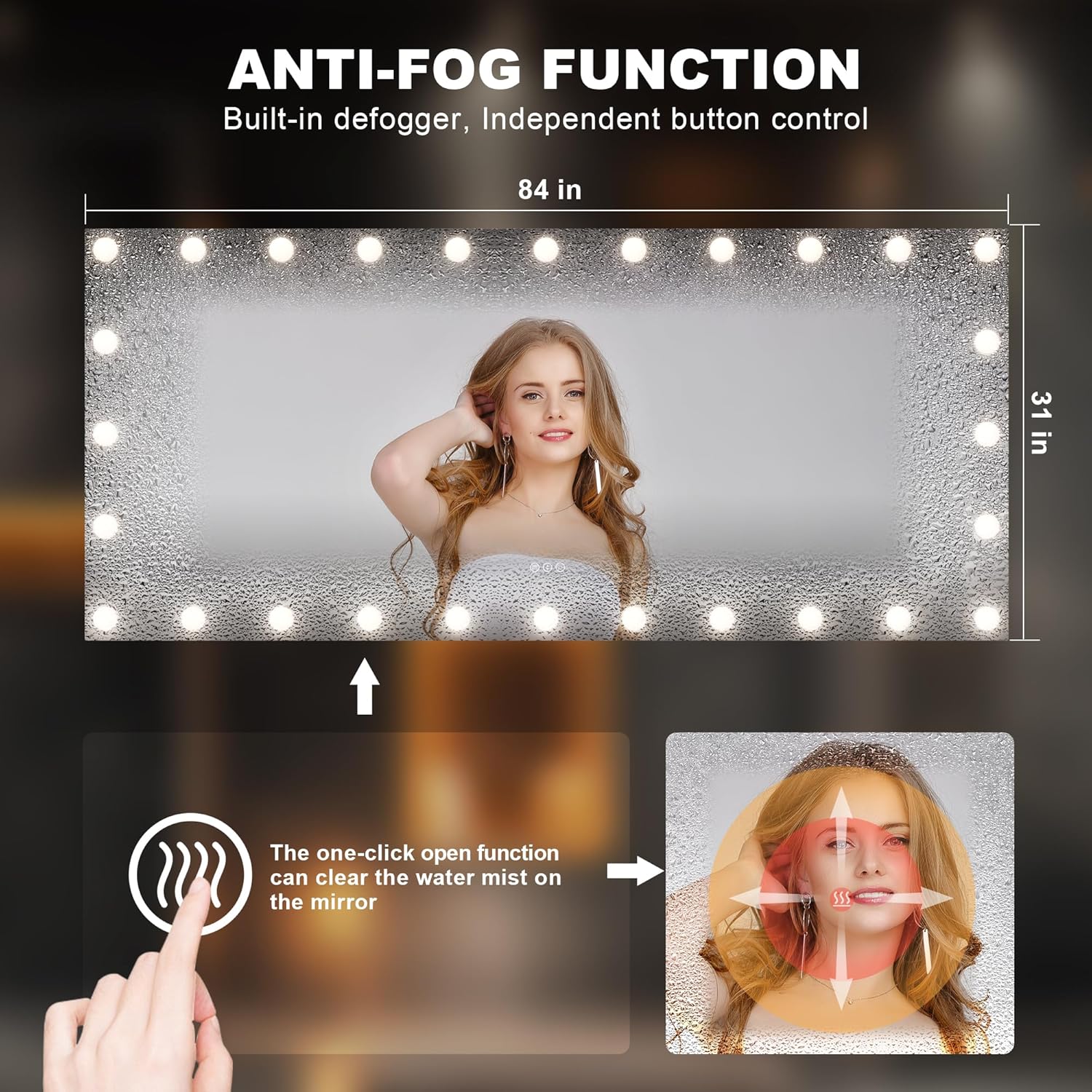 - 【Upgraded Anti-Fog & Smart Touch Screen】 Our bathroom mirror features an enhanced anti-fog function with a large heating film for faster fog removal, ensuring a clear reflection after your shower. The smart touch screen allows easy control of lights, color modes, and brightness, offering a sleek and convenient experience.