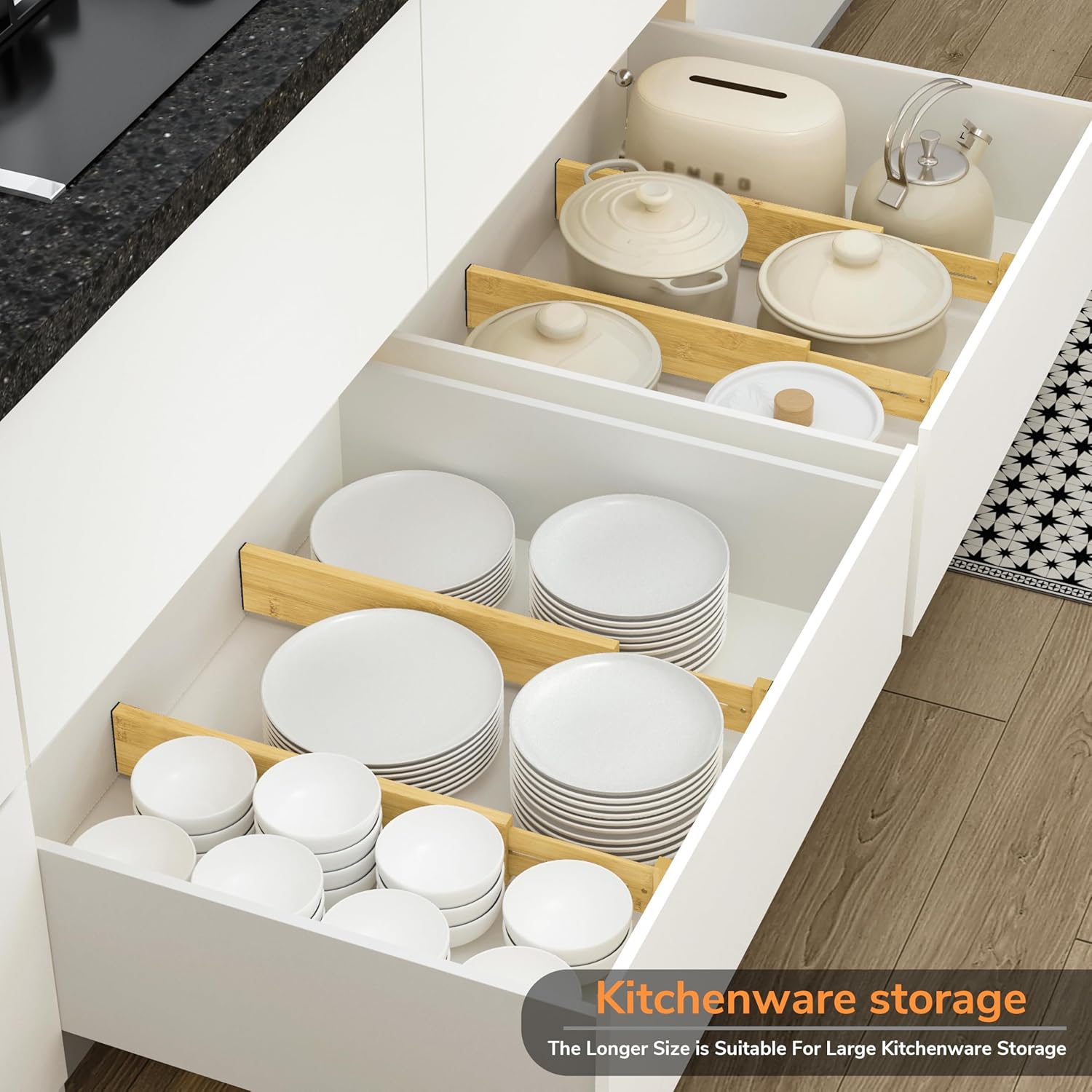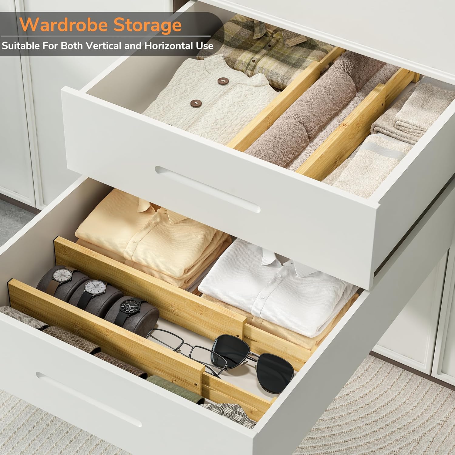 - Premium Bamboo Material: These bamboo drawer dividers are made of high quality bamboo material, natural color, tough texture, smooth surface, well made and long-lasting; Simply wipe it with a damp cloth
