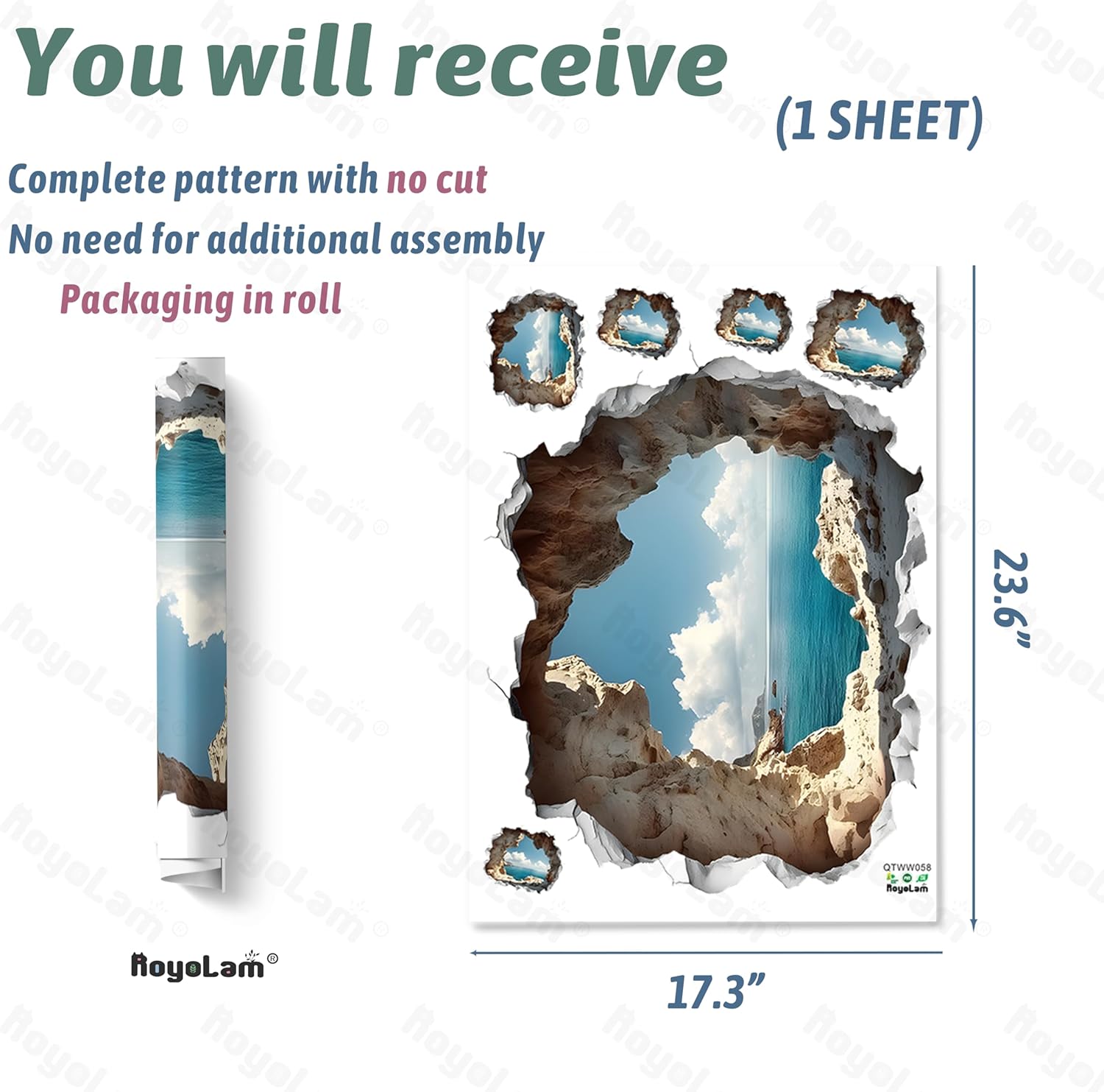 - Design: Designed by RoyoLam team (US and CN); 3D cave in the wall with a view of the sea and sky; great gift for your kids, grandchildren, neighbors or friends; wake up your wall, brighten your mood