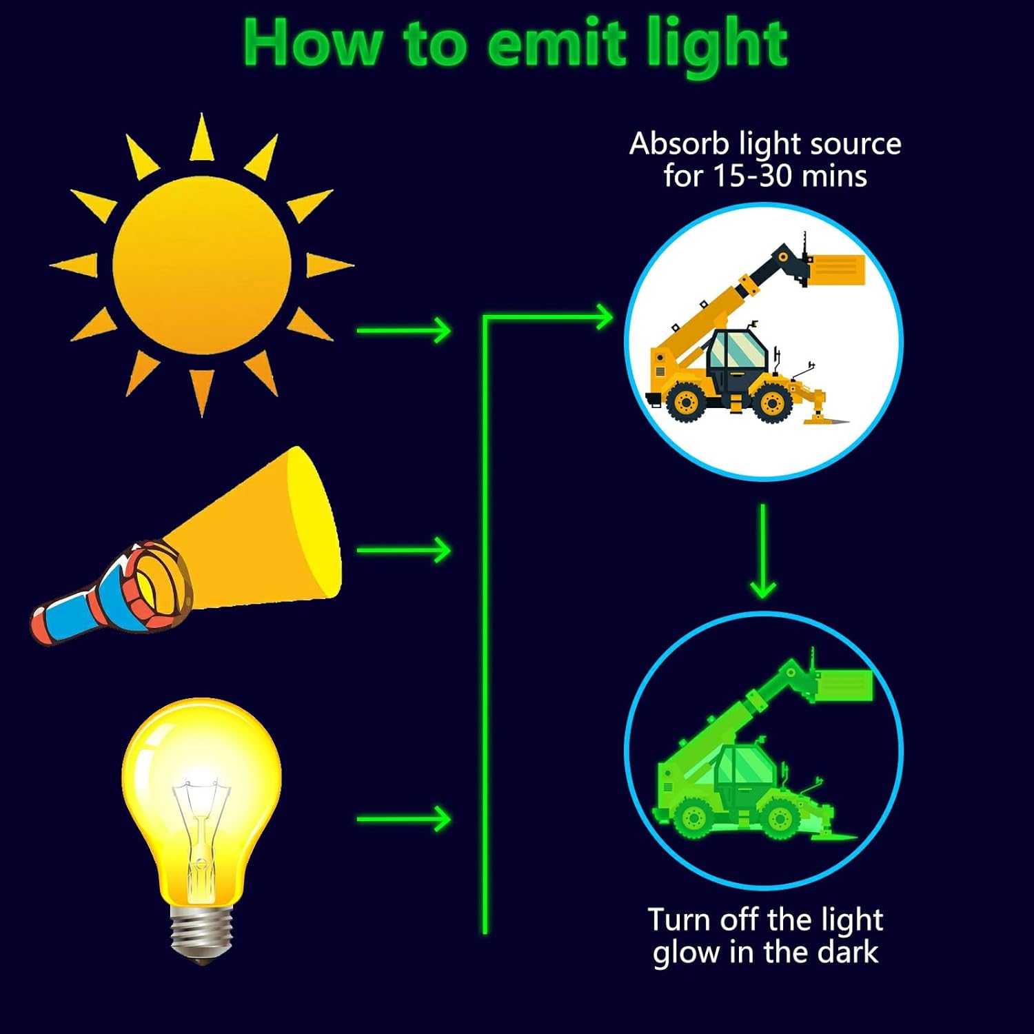 - ✦ Glow Construction Wall Decals: These glow wall decals for ceiling are made of quality luminous material,they will glow brightly when absorb enough light during the day. You just need to put it under lamplight flashlight ,room light or sunshine for 15 minutes, it will keep glowing for 8-10 hours with a gentle green fluorescent light. Please ensure the light shines on the decals without obstruction, the longer it takes to absorb light, then to light up for up to longer.