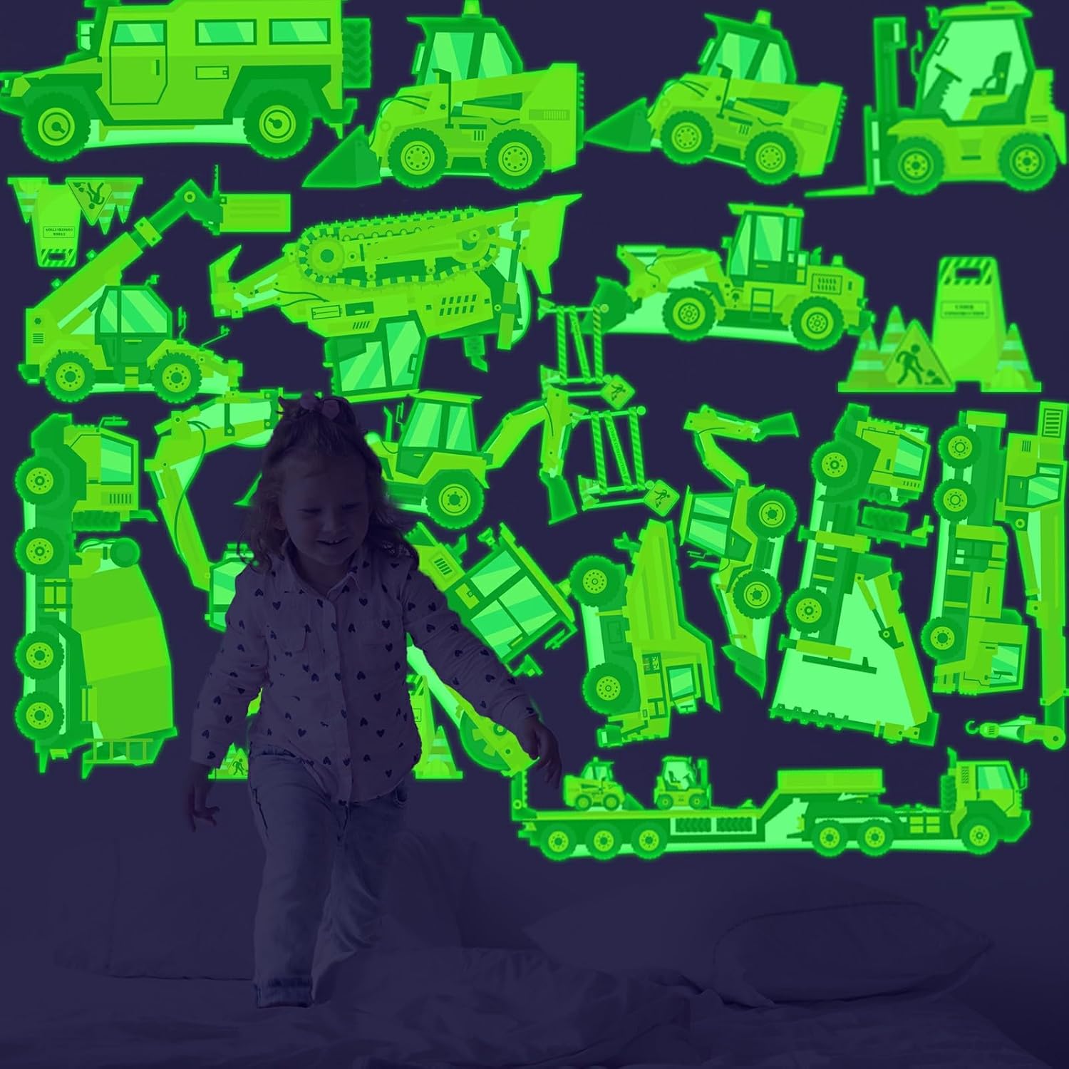 - ✦ DIY Wall Decals: You will get 4 sheets (Size of each sheet: 11.8 x 8.26 inch) of glowing Luminous Construction wall decals in a set, come with different sizes trucks, excavators, cranes, dump trucks, bulldozers, cement mixers, warning signs, etc. Can be combined arbitrarily, children can DIY an imaginative magical glowing space.