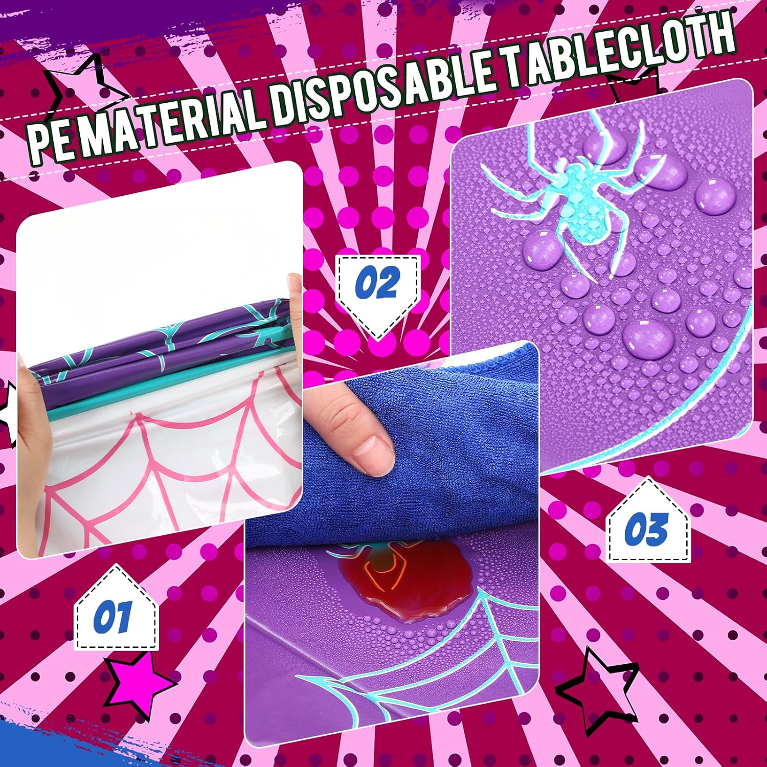 - Durable Material: experience quality with our spider themed birthday table covers; Made from sturdy and reliable plastic, these rectangular tablecloths are waterproof, keeping your tables dry and clean; They're easy to clean, saving you valuable time during party preparations