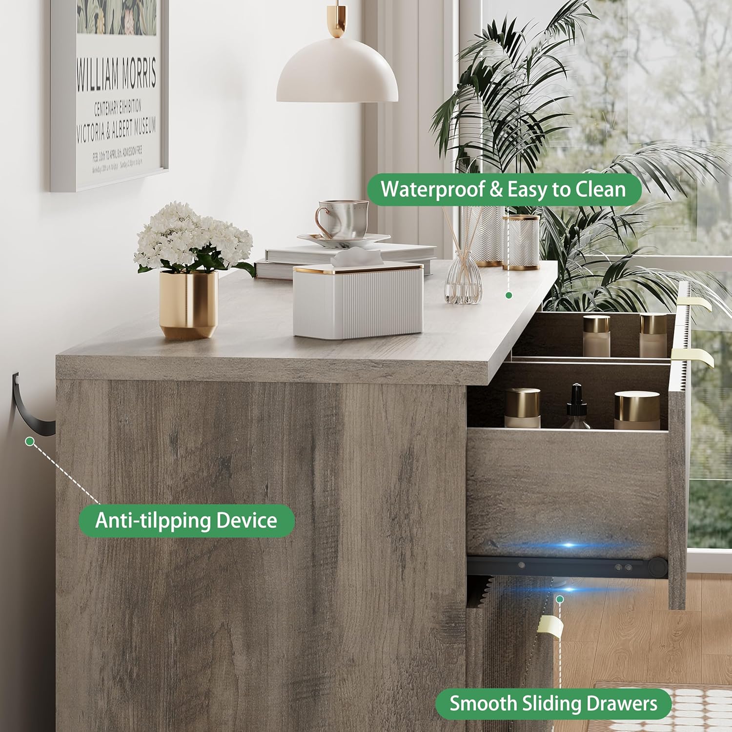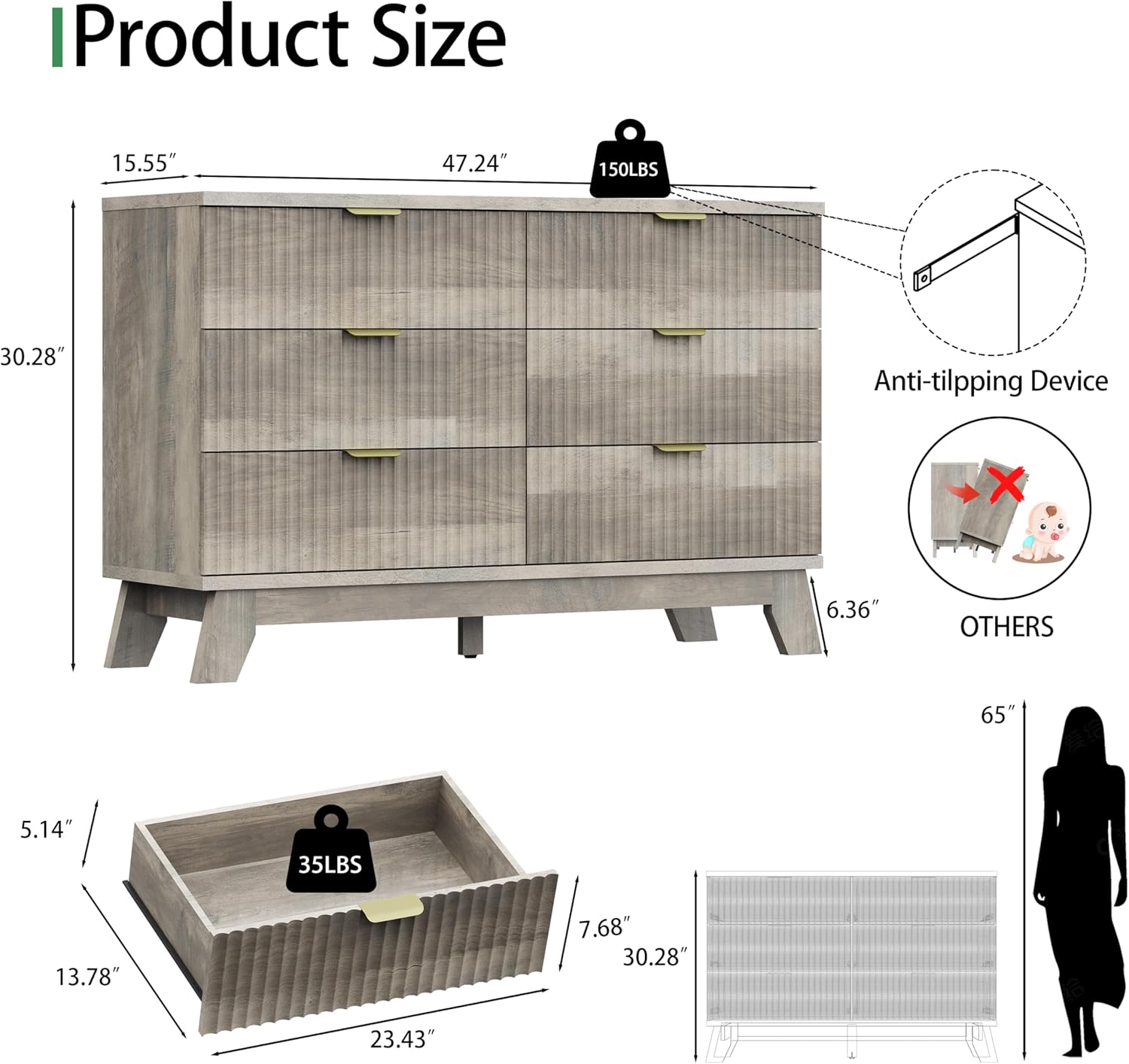 - ăStability & SafetyăThe white/black/natural oak dresser is equipped with an anti-tipping device, which can be fixed on the wall to prevent accidents. Each drawer contains a wide metal handle and built-in slide rail, easy to push and pull. Besides, the sturdy base provides this dresser with drawers a strong support and the middle feet can be adjustable to keep balance on uneven floors