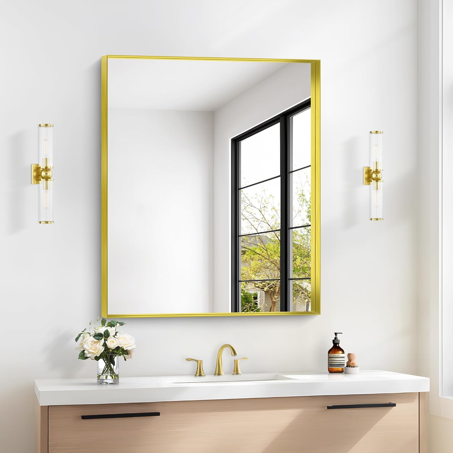 - Crystal-Clear Reflection, Zero Distortion: This gold wall-mounted bathroom mirror delivers a true 1:1 image reflection—no blurring, warping, or distortion. The ultra-durable glass is scratch-resistant and easy to clean, making it the perfect vanity mirror for a sleek, modern bathroom
